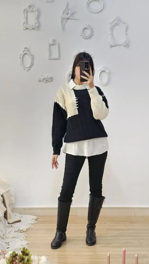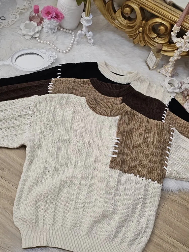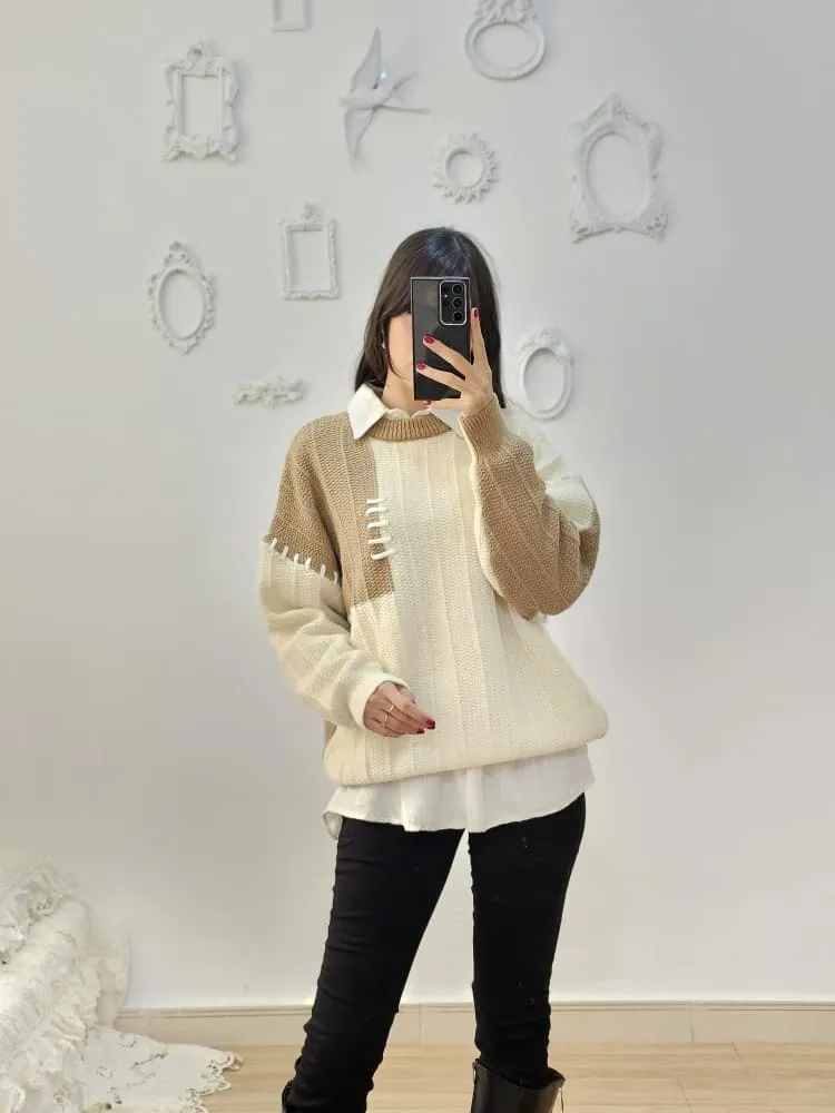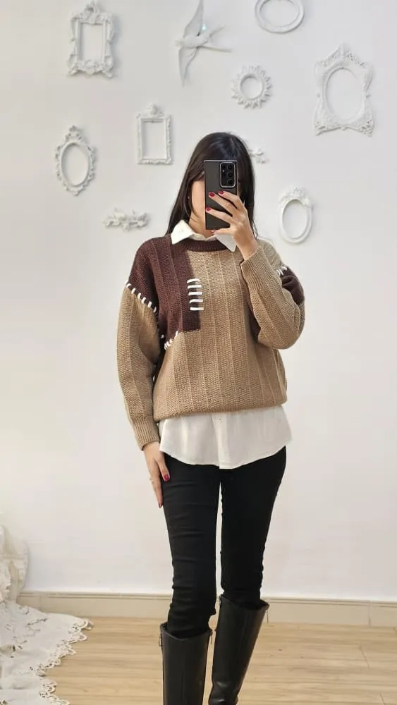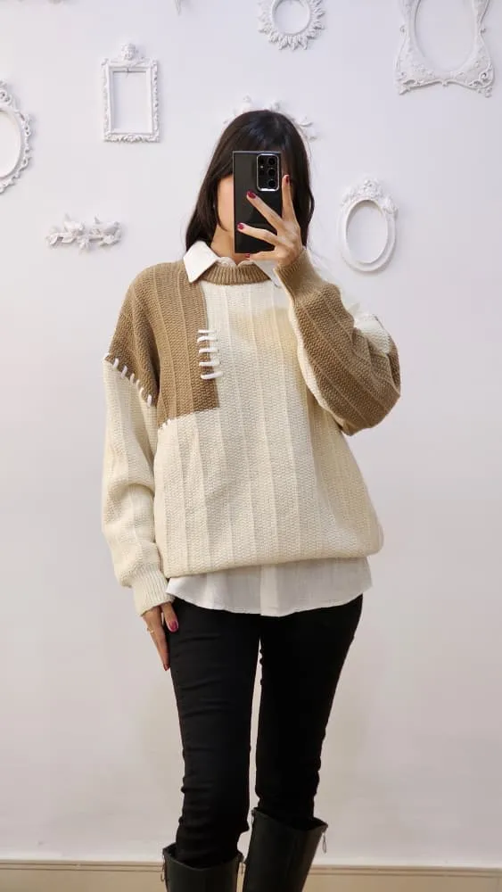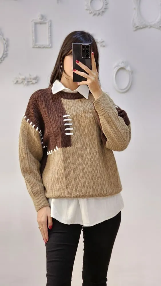 بلوز بافتی نرم و لطف با طرح تکه ای دو رنگ