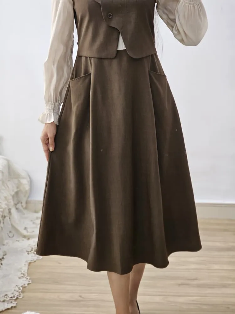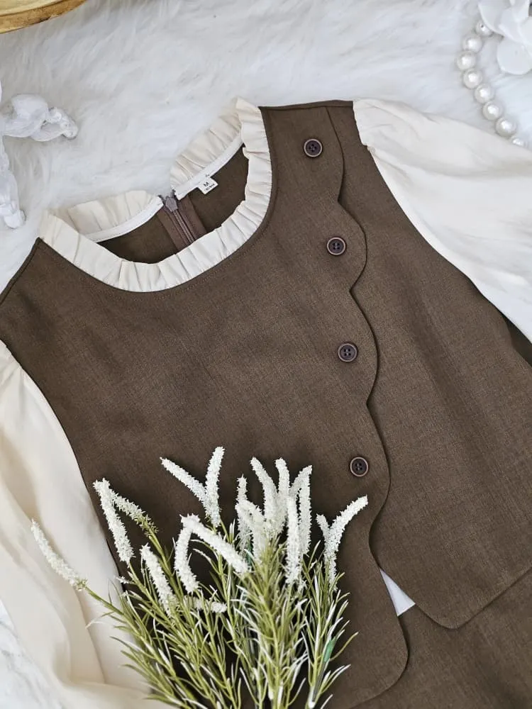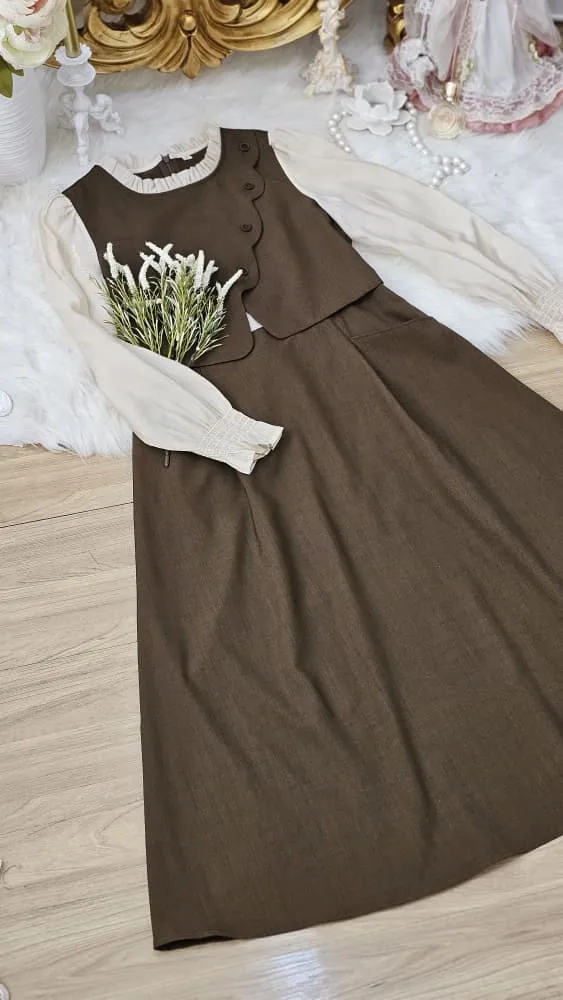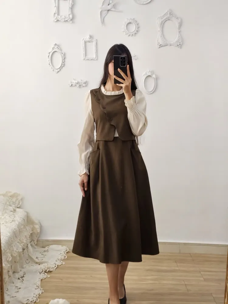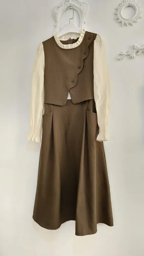جلیقه  دامن کرپ و بلوز حریر که بهم وصل هستند و یک پیراهن با ظاهر کت و دامن نمایش داده می شود. تک رنگ سایزبندی M,L,,XL.2XL,3XL